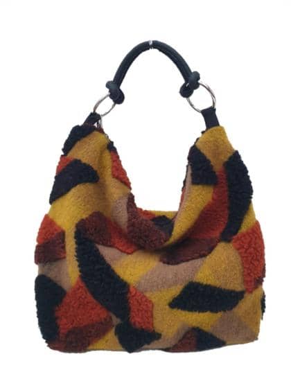 Bolso tipo cartera en lana boucles, asa en el hombro y bandolera ajustable, forrado resistente, doble bolsillo interior, uno con cremallera y el otro para teléfono móvil. Bolsa versátil adecuada para el uso diario. Dimensiones 42x42x13 cm