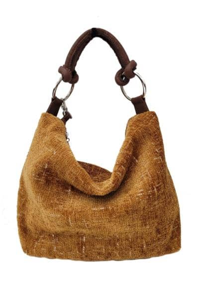 Bolso de lana tejida con asa y bandolera de ecopiel marrón. Forro negro con doble bolsillo, un bolsillo con cremallera