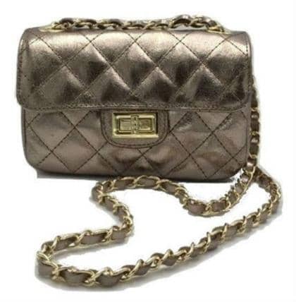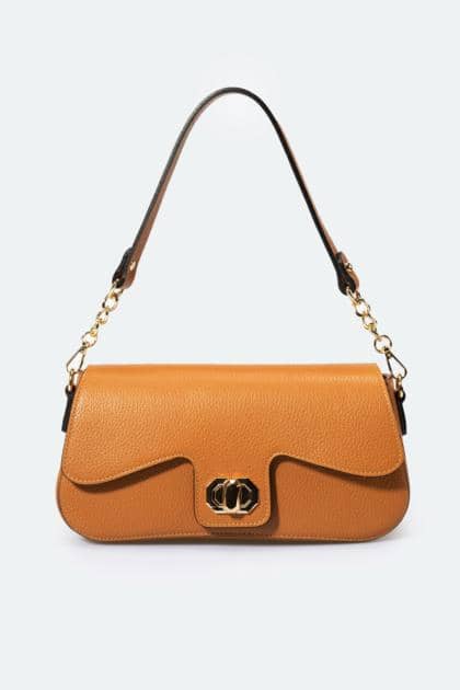 Genuine leather bag, Made in Italy. Accessory flap closure, Internal mobile phone pocket, Gold-colored metal accessories. Removable shoulder strap in adjustable leather and gold chain.