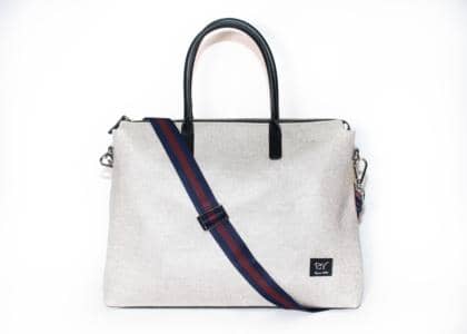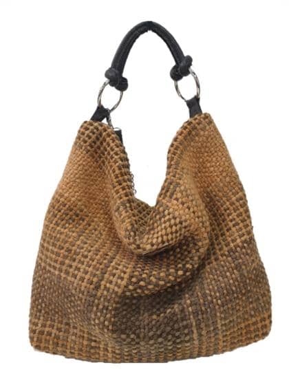 Woven wool bag with brown eco-leather handle and shoulder strap. Black lining with double pocket, one zip pocket