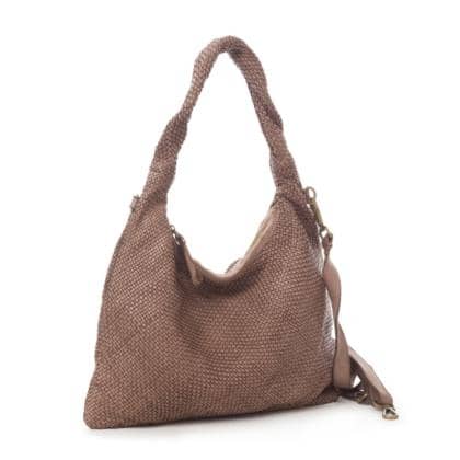 Women's vintage hand woven shoulder bag made of soft calf leather washed and garment dyed, made in Italy. Zip closure, inside pockets and zip pocket, with adjustable shoulder strap. size: 42l x 1d x 32h